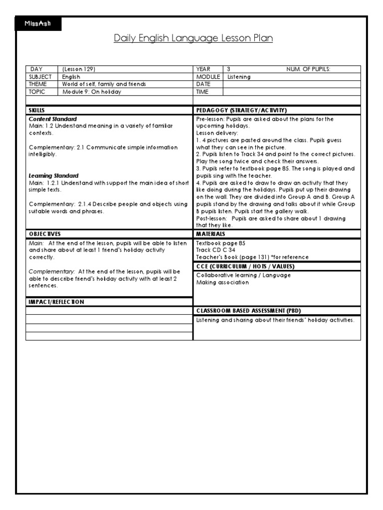 Daily English Language Lesson Plan Missash Pdf Lesson Plan Curriculum